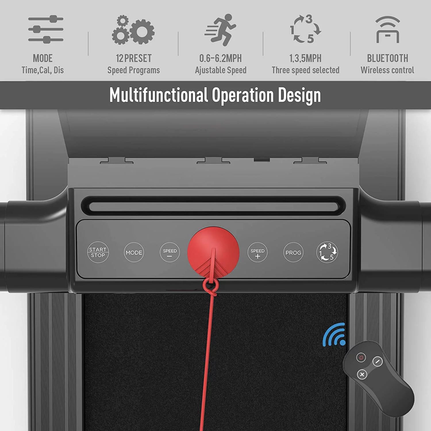 5-layer non-slip and shock-absorbing running belt provides effective cushioning for your back . joints . muscles . knees and ankles. You can connect the treadmill to your phone through Bluetooth and play music while you are exercising. Equipped with a remote control and a safety key for immediate closure in an emergency.