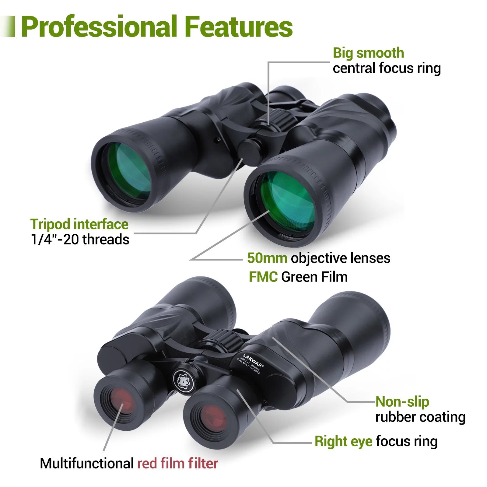 LAKWAR aims to provide the most cost-effective gear for every explorer! When you first pick up a binocular and set foot on the road to the distance . you’ll never stop.Our Waterproof Binoculars are designed with 20X high-power magnification and a 50mm wide-angle objective lens . offering a large 305ft/1000yds field view when in use. These binoculars feature night vision capability . large BAK-4 Prism . fully multi-coated objective lens and eyepiece . enabling adventurers to observe targets clearly even in low-light environments like cloudy or dusk settings.This bird-watching binocular is compact . anti-skid . fog-proof . and waterproof . making it especially suitable for outdoor activities such as bird watching . hunting . travel . stargazing . and camping.Whether it’s for an upcoming Christmas . birthday . or Father’s Day . it’s the ideal choice for everyone looking to select a gift.