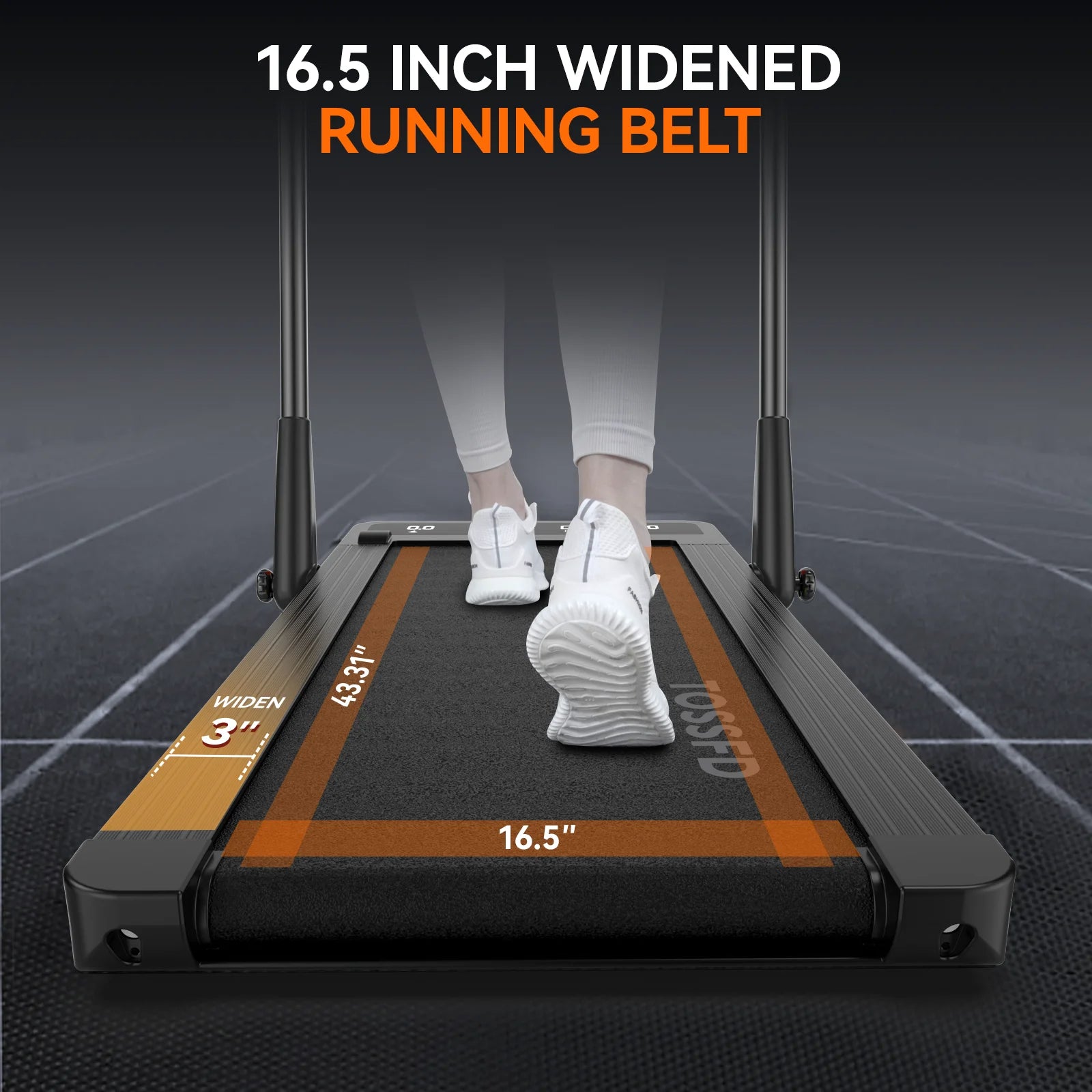 Besides . pooboo treadmill is designed with 5-Layer anti-slip shock-absorbing running belt . which has 43.3″ * 17″ large running area . 3″ widen running edge could provides effective cushioning for your joints and muscles . ensuring a safe and comfortable workout.