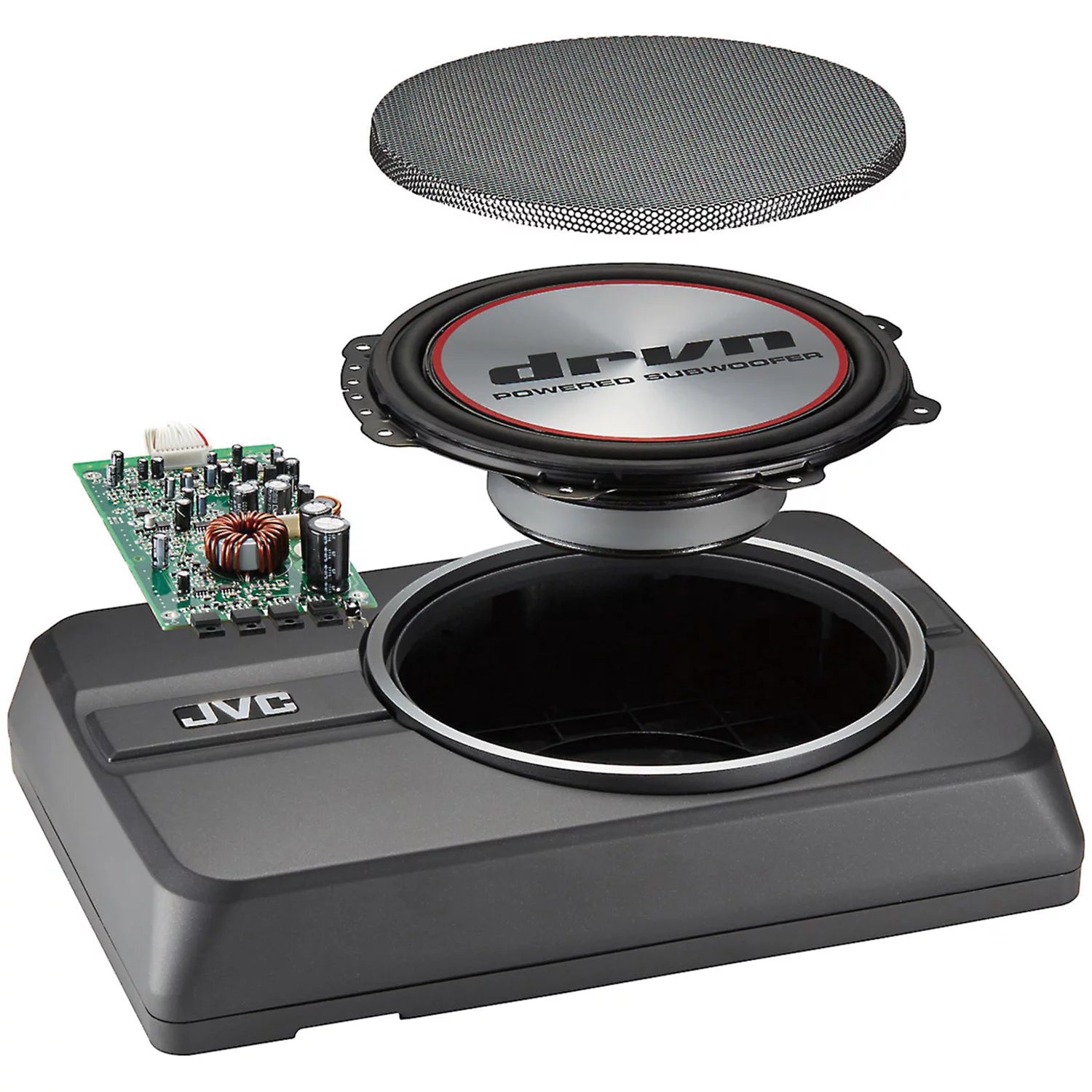 Limited space? The JVC Mobile CW-DRA8 drvn A Series 8 in. 250-Watt Powered Subwoofer gives you deep . full bass from a low profile enclosure. This powered subwoofer easily fits under your car’s seat or in a corner of your trunk. Its built-in amplifier delivers 150 watts RMS to the 8 in. sub . and its Class D design ensures that it’ll run cool in some very tight places.
