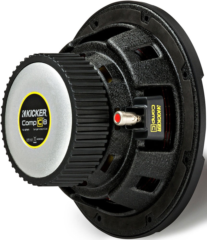 You know your sound system is kicking it when you can feel your tunes. Enjoy the thump and thrum of your music with the KICKER CompC 8-Inch Dual 4 Ohm SVC Voice Coil Car Audio Subwoofer. This car subwoofer is engineered for reliable performance and banging . thumping sound. This sub features 4-ohm dual voice coils . making it easy to get the most out of your power amp. The motor structure itself is a mechanical marvel . utilizing a large-diameter . progressive-roll spider for increased linearity and fantastic sound.Choose the set-up that works best for your car sound system. This car audio subwoofer is rated at 200 watts RMS power and 400 watts peak power. Equipped with a stamped steel frame and world-class durability for hard-hitting . high-performance bass. An injection-molded polypropylene cone will ensure a high-performing sound. This car subwoofer requires 3.87 inches of mounting depth and 7 inches of mounting diameter in your sub box. Kick up the sound in your ride with the KICKER CompC8-Inch Dual 4 Ohm SVC Voice Coil Car Audio Subwoofer.