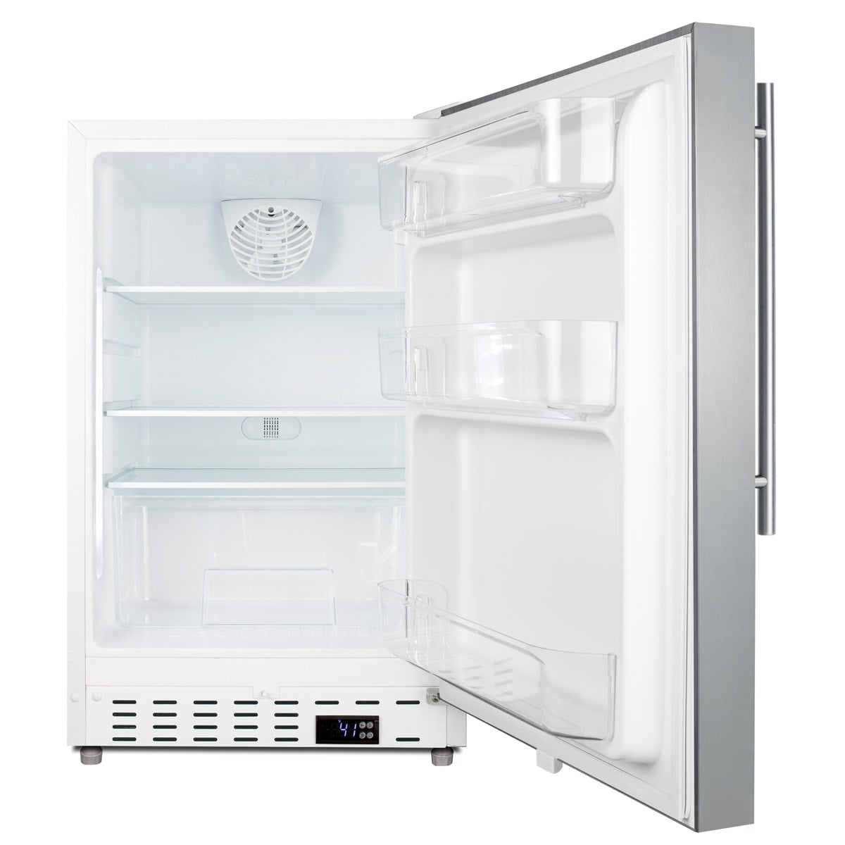 Summit Appliance offers a quality selection of 21" wide built-in undercounter all-refrigerators designed for installation under lower ADA compliant counters, with advanced features for user convenience.The ALR46WSSHV is sized at 32" high to fit under lower counters complying with ADA guidelines for accessibility. The fully finished textured white cabinet allows freestanding use, while the front-breathing system means this unit can be built-in with minimum clearance. The user-reversible, stainless steel door is 3" thick for efficient insulation, with a sleek vertical handle with a thin 14mm diameter, a popular style that matches many common cabinet handles. This unit comes with a right angle cord to allow for easier placement without added depth. A digital thermostat, located in the kickplate, makes for easy temperature management with a readout in Fahrenheit or Celsius. Inside, the ALR46WSSHV features an all-white interior for easy cleaning and viewing of contents. An LED light located toward the front of the unit attractively illuminates the interior when the door opens. Automatic defrost operation ensures minimal user maintenance, with an internal fan to help ensure even cooling throughout the 3.53 cu.ft. interior. Three adjustable glass shelves offer optimal storage options for large and small items, while a pull-out crisper drawer provides storage for fruits and vegetables. Three removable door racks accommodate additional storage as needed. The user-set high and low-temperature alarms provide added security should the temperature go beyond the setpoint, while the open door alarm sounds if the door is ajar over one minute for added peace-of-mind. These alarms can be disabled depending on your needs. Sized at just 21" wide, the ALR46WSSHV is the perfect addition for space-challenged environments seeking dependable freezer options in a durable design.