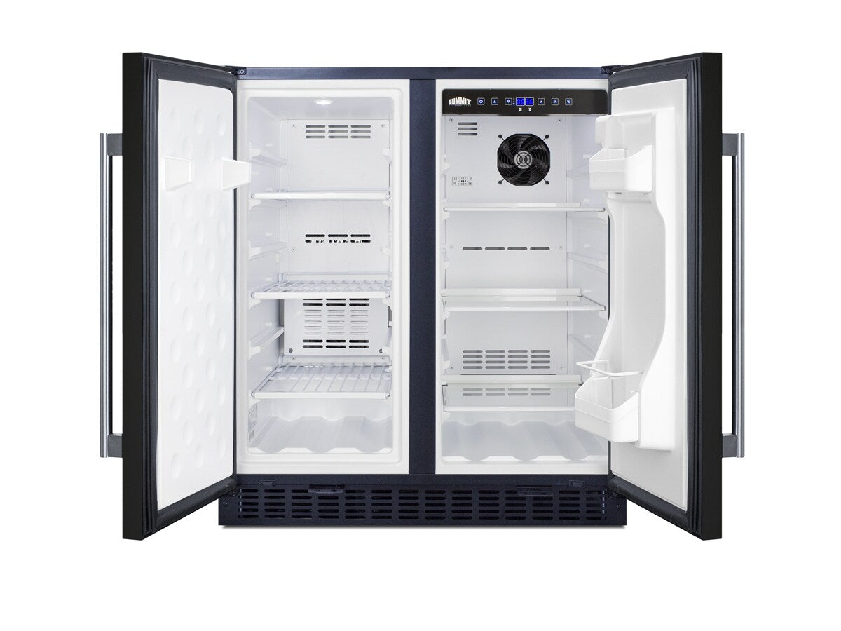 SUMMIT brings quality and value under the counter with a large collection of built-in refrigeration. Sized at 30" wide, the FFRF3070BSS is an all-in-one side-by-side refrigerator-freezer. The front breathing design allows built-in installation under counters, while the fully finished cabinet also enables freestanding use. This unit features a jet black cabinet with two stainless steel wrapped doors with pro style handles. The sealed back ensures easier cleanup with added space savings. Inside, the FFRF3070BSS features a 2.4 cu.ft. frost-free freezer compartment on the left and a 3 cu.ft. frost-free refrigerator compartment on the right. The refrigerator includes a digital thermostat allowing users to manage the temperature in each compartment, with a readout in Celsius or Fahrenheit for added convenience. Adjustable glass shelves offer cleaner spill-proof storage for fresh food items, while two removable door shelves provide additional storage space as needed. An internal fan assures the compartment is cooled evenly from top to bottom. The freezer compartment includes adjustable wire shelves to ensure proper cold air circulation. Both sides feature LED lighting to provide an attractive, energy efficient presentation. The slotted floor design is ideal for keeping bottles safely in place. Additional features include an open door alarm, high temperature alarm, and Sabbath mode setting that allows you to disable certain functions during religious observance. With its innovative all-in-one design, user-friendly features, and full frost-free operation, the FFRF3070BSS is a great choice for smaller kitchens looking to maximize storage space under the counter.