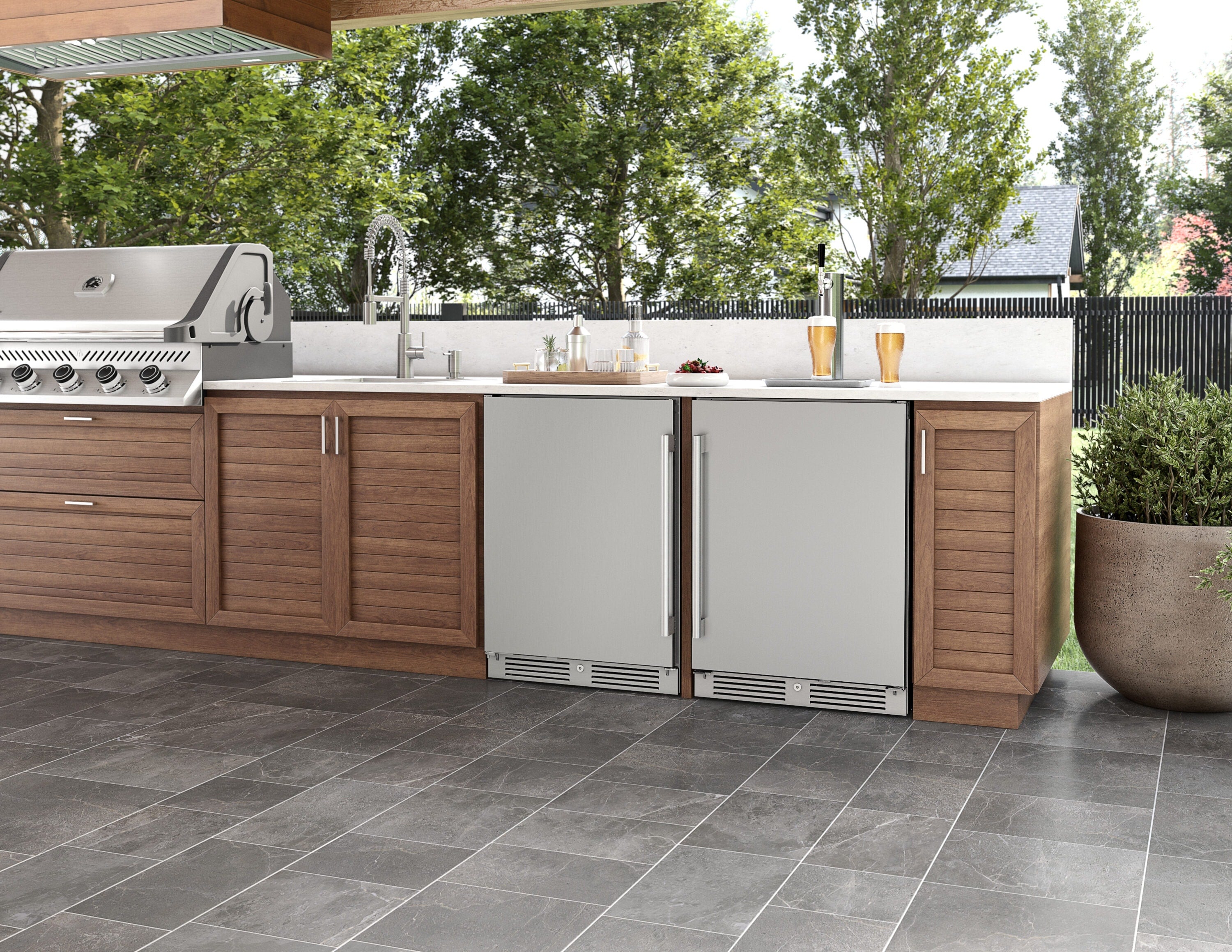 Bring the party al fresco with our new Outdoor Refrigerator. The perfect co-host, this Outdoor and Indoor-certified model is ready to serve up food and drinks to wow your guests from apps right through dessert. Features include party-ready perks like adjustable shelving, customizable door shelving — accommodating two-liter and gallon jugs — all-white interior, sleek stainless steel exterior, white LED lighting and door lock.