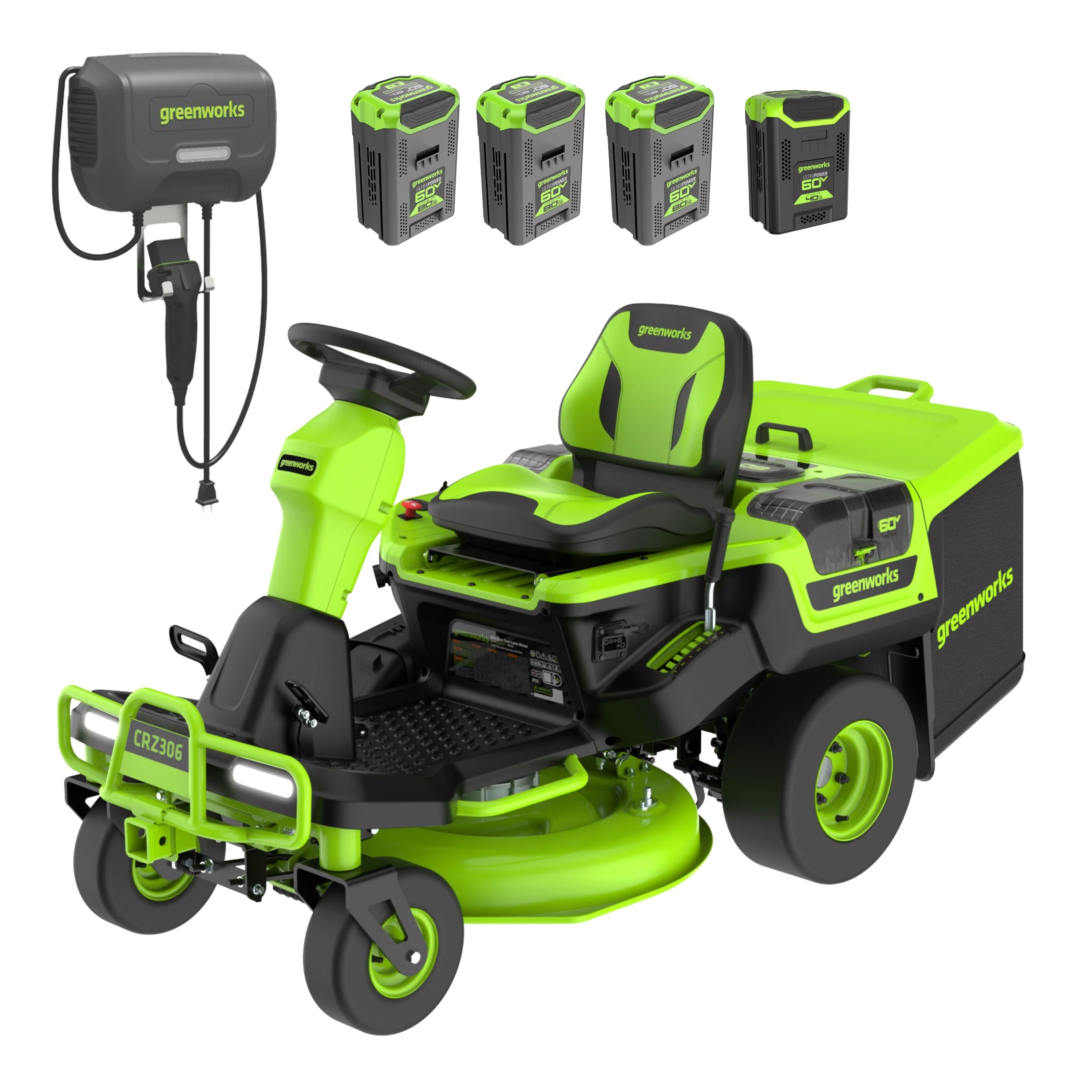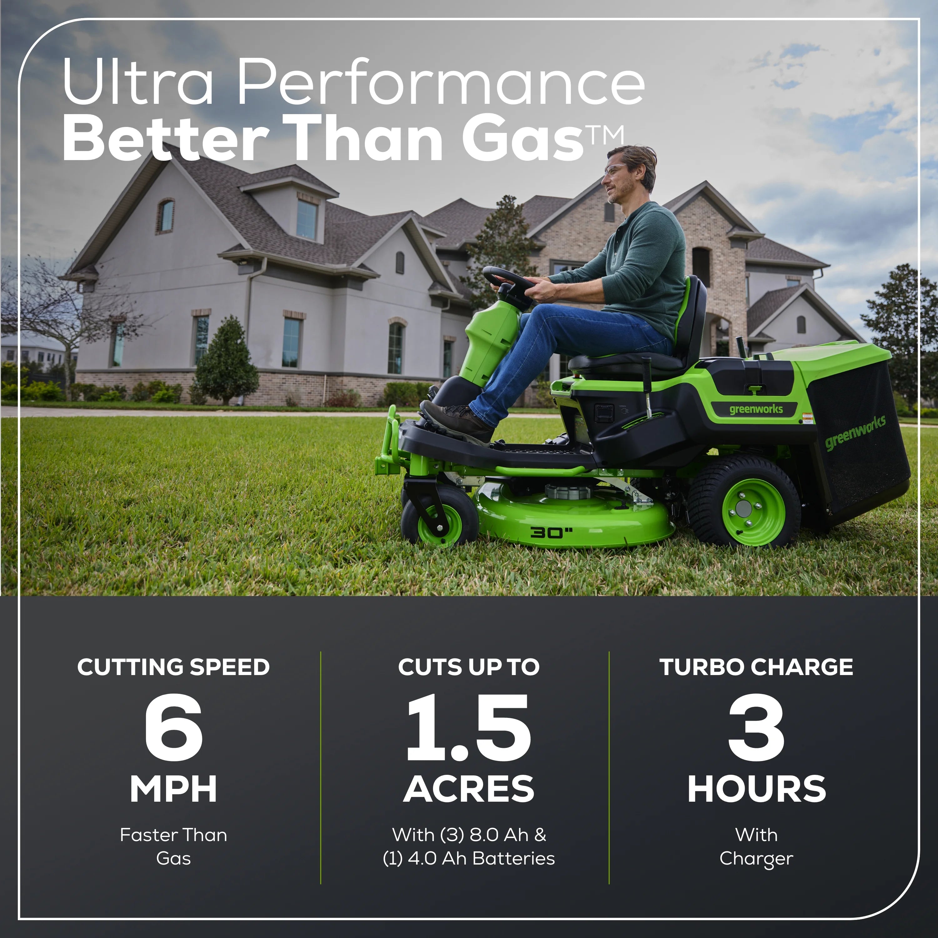 Quickly mow up to 1.5 acres on a single charge . then fully recharge batteries in less than 3 hours with the Greenworks 60V 30?? 23 HP Electric Battery-Powered CrossoverZ Zero-Turn Riding Lawn Mower . with (3) 8.0 Ah . & (1) 4.0 Ah Batteries and 600-Watt Charger. Never bog down in tall . thick . or wet grass . thanks to the high torque cutting motor. Feel the unmatched power with zero-turn steering wheel systems and two high-torque brushless hub motors that mow at speeds up to 6 MPH. Greenworks unrivaled Intelligent Power combines brushless motor technology . cutting . drive . control . and battery systems to sense and auto-adapt power for the job at hand with a power output equivalent to a 23 HP gas-powered motor. Includes (3) 8.0 Ah . & (1) 4.0 Ah Batteries and 600-Watt Charger. Battery is compatible with 75+ Greenworks 60V products.