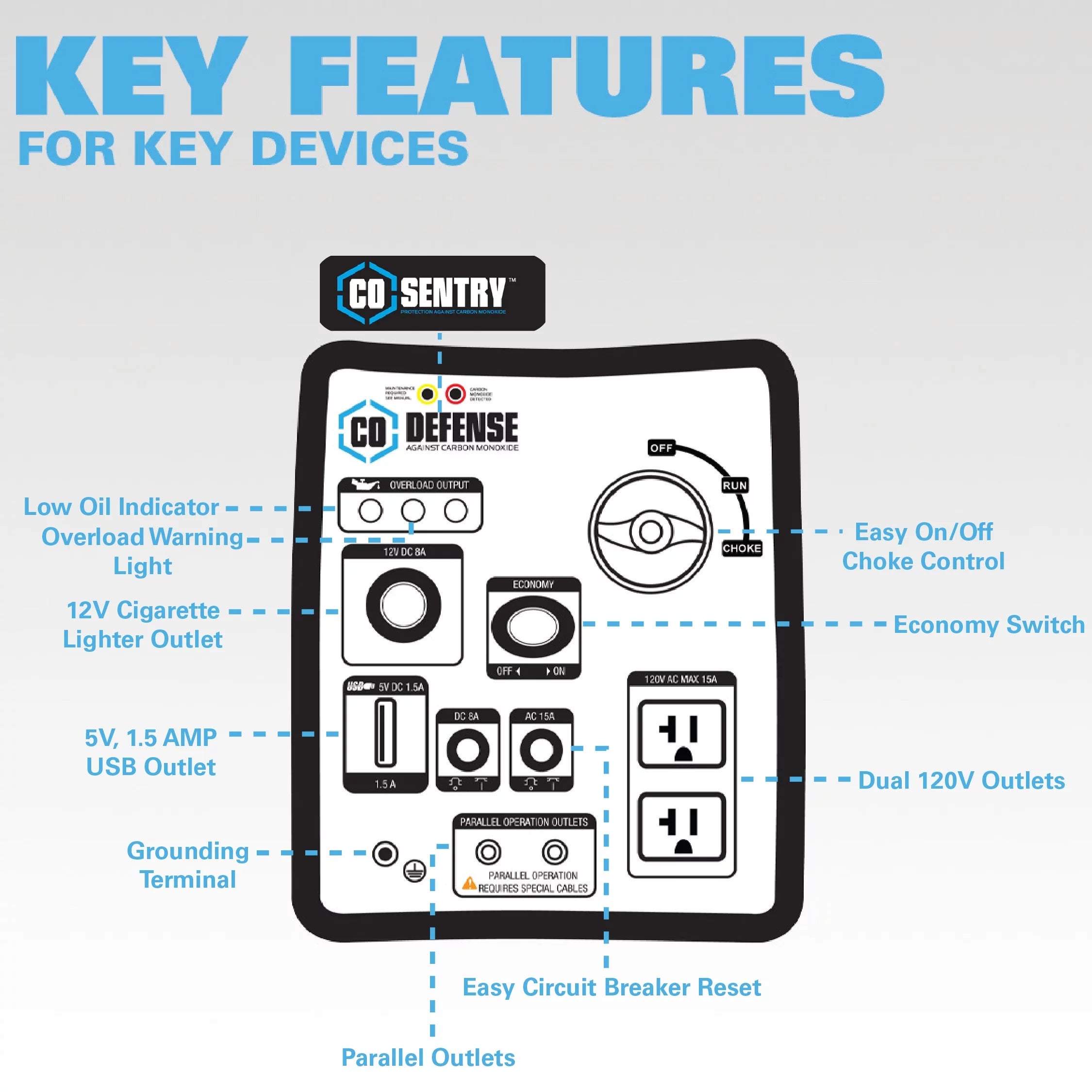 In terms of safety features . the generator is equipped with an automatic CO shutoff with carbon monoxide sensor . providing additional protection for your safety. The 1.18-gallon fuel tank offers up to 6 hours of operation at half load . and the stable sine wave technology allows you to power sensitive electronics safely. The generator also features a low oil indicator and low oil shut-off . ensuring that it shuts down when the oil level is low. Economy mode improves fuel efficiency . and automatic voltage regulation ensures that the generator runs smoothly. It comes equipped with a recoil start for easy use.