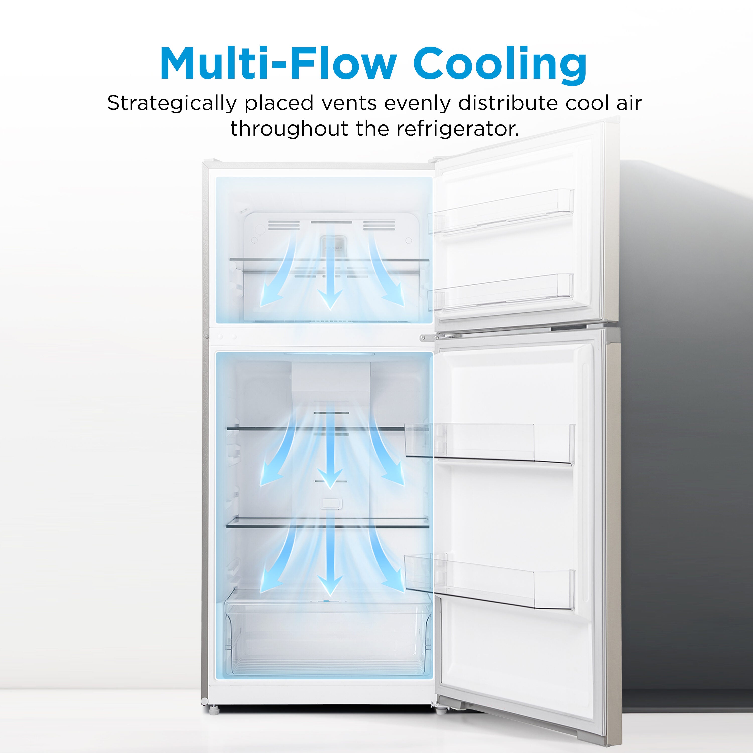 Multi-Flow Cooling Design: Strategically placed vents evenly distribute cool air throughout the refrigerator, ensuring that ideal temperatures are maintained in every interior space.