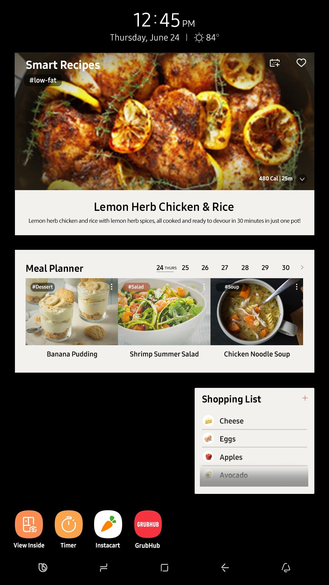 Cooking: See what’s inside your fridge with your phone, or just swipe or tap the screen - SmartThings Cooking provides instant access to meal ideas and can remotely preheat your oven
