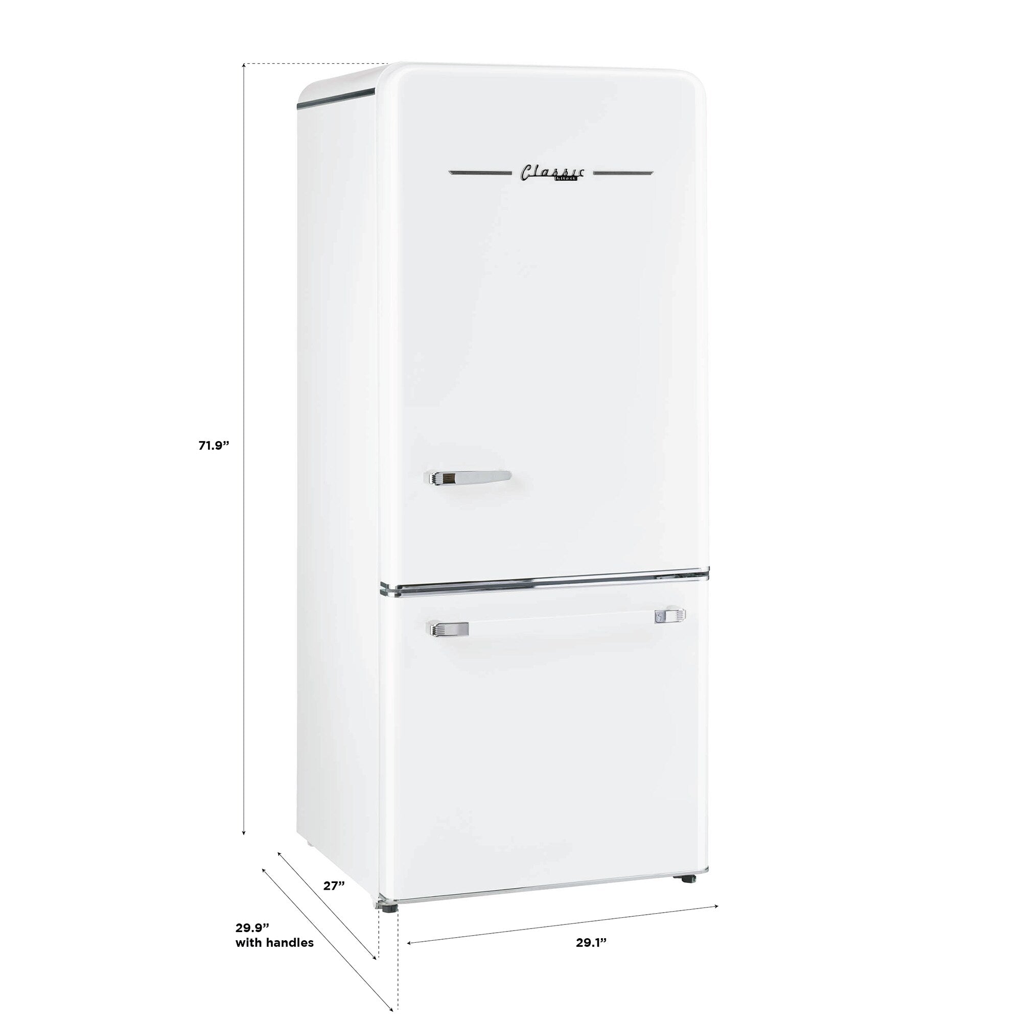 The 18 cu. Ft. Classic Retro counter-depth bottom mount refrigerator is the perfect family sized refrigerator with ample space to keep all your fresh and frozen foods, packaged in an eye-catching throwback design. This refrigerator is energy star certified for energy efficiency all year-round, designed for optimal energy savings and easy, dependable use. Its frost-free design allows easy cleaning without dealing with frost buildup. It also comes with a built-in icemaker. Create a Unique classic retro kitchen!
