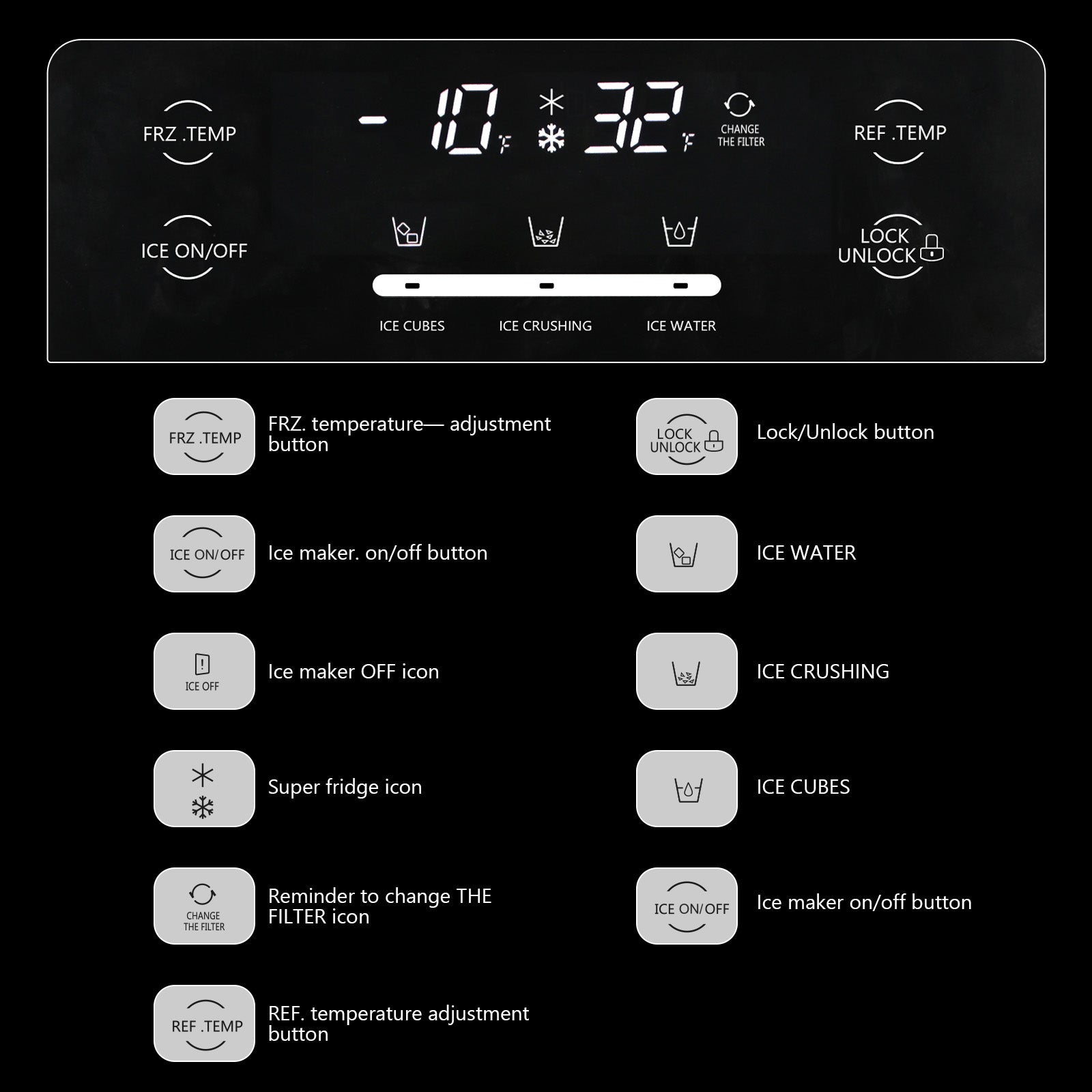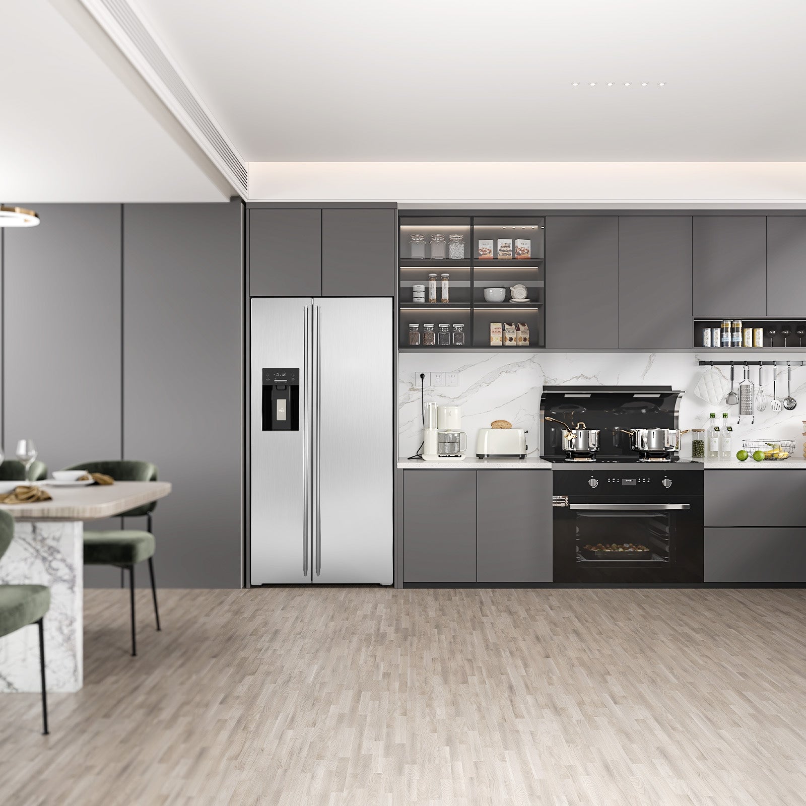 COWSAR 20 CU.FT. 2-in-1 side by side refrigerator with ice maker, with its remarkable performance in large capacity, multi-functionality and intelligence, will bring you a more convenient and comfortable life experience. Boasting a fresh food capacity of 13.48 cu. ft. and a freezer capacity of 6.53 cu. ft., it offers ample space with efficient organization. The fresh food compartment includes 4 spill-proof glass shelves, 2 plastic bins, and 4 door racks, while the freezer features 3 spill-proof glass shelves, 2 storage drawers, and 2 door bins. Besides that, it includes a ice storage box and water/ice dispenser. This side by side refrigerator can be used as an ice maker, which can produce 3.3lbs ice cubes/nugget ice cubes per 24 hours. It can be also dispensed cold water. The Effortlessly adjust temperatures with LED touch controls. Fast cool and fast freeze preserve freshness with rapid temperature setting(Max temp 43°F). High-efficiency LED lighting to illuminate every corner. The compressor inverter ensures energy efficiency, quiet operation, and precise temperature control. See-through drawers and door bins enhance organization. Upgrade your kitchen with COWSAR refrigerator– where innovation meets elegance, guaranteeing freshness at your fingertips, expecting it to brighten up your life. Please free standing place the refrigerator in a well-ventilated place, reserve 5-12 inch space around and behind the refrigerator, and do not cover or block the air grille on the rear cover plate of compressor at the back of refrigerator.