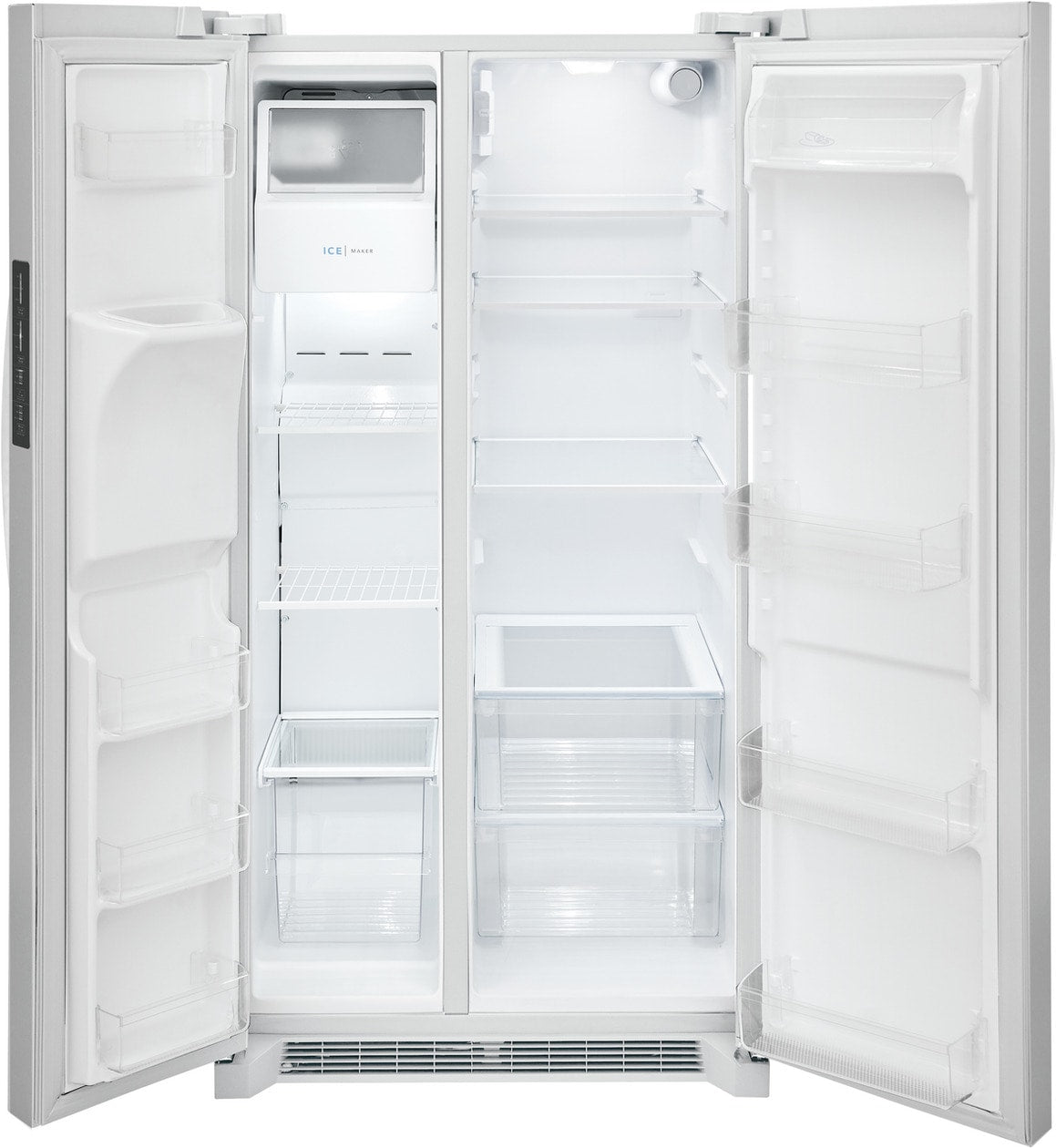 This Frigidaire 36-in side-by-side refrigerator offers our EvenTemp™ Cooling System which reacts quickly to temperature fluctuations and constantly circulates cold air throughout the fresh food and freezer compartments, ensuring a consistent cool from top to bottom. Keep fruits and vegetables fresh in our crispers that offer a seal to block out dry air. Enjoy the capacity to fit all of your family's favorites and keep everything tidy with our flexible organization system that includes adjustable gallon door bins, removable glass shelves and two produce drawers. Awarded the Best Overall Side by Side Refrigerator of 2023 by Reviewed.com (USA Today).