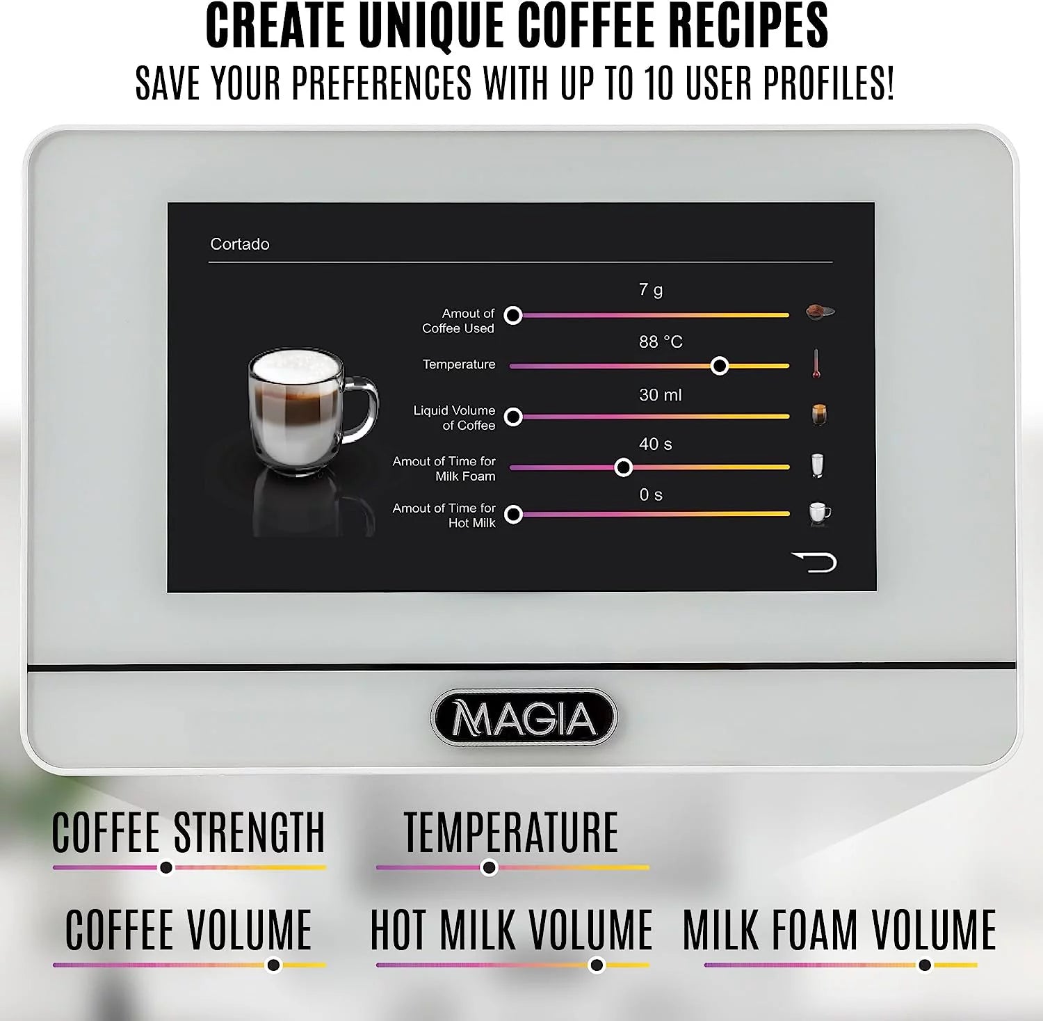 Why go to a coffee-shop when you have this fully automatic coffee machine that can make any coffee just the way you love? Our Zulay Kitchen Magia Super Automatic Coffee Espresso Machine Espresso Coffee Maker 1800ml – White is programmed with 19 specialty drinks . brewed fresh at the touch of a button. Making espresso . Americano . cappuccino . latte . or flat white has never been this simple. Your very own at-home Barista! Bring out the rich and aromatic flavor of coffee beans with this coffee machine with grinder. Make it light or strong by adding coffee beans into the bean hopper (250g capacity) and adjusting the conical burr grinder to achieve coarse grains or fine coffee powder. You can also use pre-ground coffee by putting cups of powder into the chute. This smart coffee maker is designed with a milk frothing system that lets you automatically add a velvety foam on cappuccino or latte. It comes with an insulated milk jug and an ice pack to keep milk fresh and cold for hours. This automatic espresso maker also allows you to heat or froth a cup of milk and heat a cup of water by selecting the ??Hot Milk?? . ??Hot Milk Foam?? . or ??Hot Water?? icons. Endless opportunities! Weight: 31.7 lbs. Manufacturer Part Number: ZK-MG-SPR-TMTC-CFF-MCHN-LX-WHT.